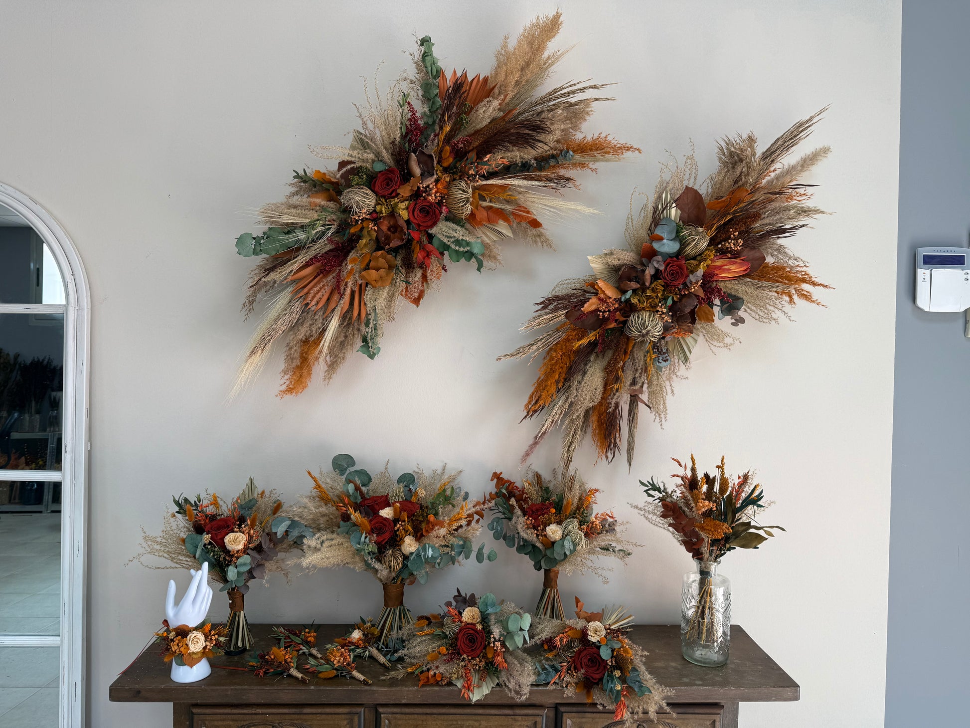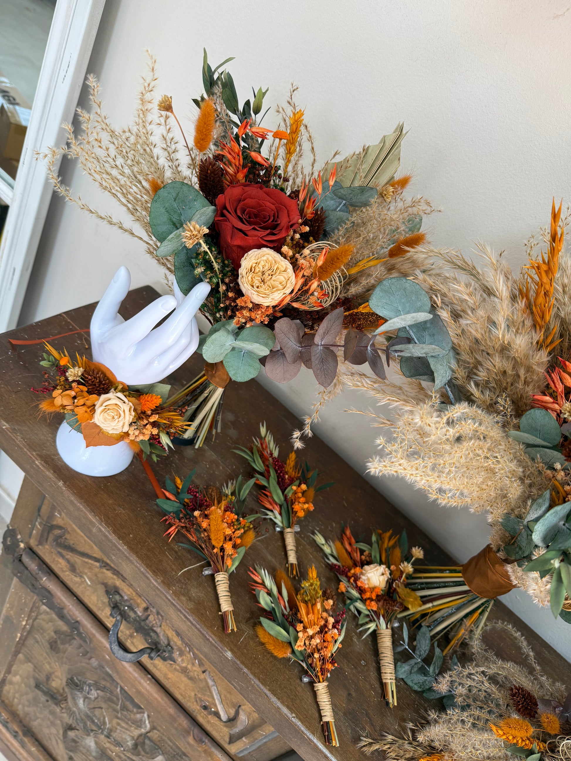 Materials: Preserved roses, Dried flowers, Eucalyptus, Preserved flowers, eternal roses, eternal flowers, infinity roses, infinity flowers, bunny tail, fern, pampas grass, baby breath, Ruscus.